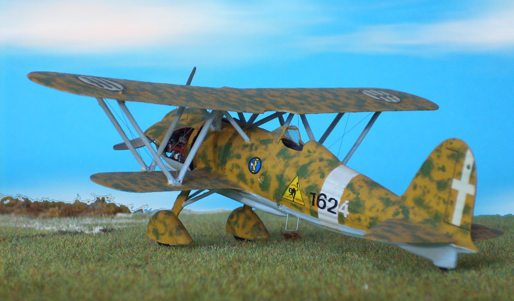 Um die Fiat CR 42 zu verbessern, waren folgende Arbeiten nötig: Genaues Arbeiten, das Ziehen einer neuen Kanzel, Anfertigen der Auspuffstutzen und Aufsägen der Motorhaube, eine Verspannung aus Angelschnur, ein Einstieg aus Kupferdraht und sauber bemalen. Also wirklich keine Hexerei. Aber der Bausatz von Supermodell ist nicht nur der einzige in 1/72, sondern wahrlich auch ein sehr guter. Das wahre Kunstsück begann mit der Tarnung. Damals, noch mit dem Pinsel und ganz gewöhnlichen Farben handgemalt, bedurfte es sehr vieler Übung, die Farben so dünn zu halten, daß sie einerseits deckten, aber andererseits flüssig genug waren um ineinander zu verlaufen. Auch auf den Großaufnahmen ist kein Pinselstrich zu sehen. Das Ergebnis ist so, als ob es gespritzt wäre. Die Kennung ist aus der Grabbelkiste. |