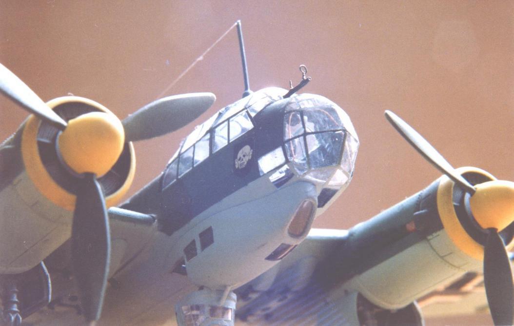 To optimize the Italeri Ju88 A-4 into Ju88 A-1 following works were necessary: Change of lower engine-cowlings; easy done with some extra upper halves. Shortening the wing-span to the correct measures, ailerons were discontinued to the wingtips. Changing the "double-bubble" of the rear-cockpit-hood inta a "single-bubble" with a self-made vacu. Also changing the front canopy into a self-made vacu. Those two vacus are much clearer than the original parts of the kit. Changing the cockpit-interior with adding of self-made seat-belts, ammunition-boxes and -belts, stores against sun-dazzle, drilling up the guns and adding self-made gun-sights (single copper-wire). The national markings on the dive-brakes were done by airbrush, the landing-light was scratchbuilt. Go to: Ju 88A-4, Ju 88C-6, Ju 88G-1, Ju 88G-6, Ju 88S-1, Ju 88 Mistel-1 |