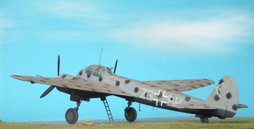 Ich erstzte die "Doppel-Blase" der hinteren Kanzel durch eine "einfache" selbstgezogene. Ebenso den Bug durch einen durchsichtigen Eigenbau-Vacu-Teil. Diese sind viel klarer als die Bausatz-Teile. Das Cockpit verbesserte ich mit selbstgemachten Sitzgurten, Muni-Kästen und -gurten, bohrte die MG auf und fertigte MG-Visiere (aus Kupferlitze). Dann tauschte ich die Motoren - hier die vom Ju 188 Bausatz - zu BMW 801 Sternmotoren. Bei den Italeri BMW gibt es kein Lüfterrad, daher fertigte ich mir selbst welche neu an. Vorsicht, andere Ausführungen - die Ju 88 S-3, T-1, T3 - hatten Jumo 213 Reihenmotoren. Die ungewöhnliche Tarnung wurde nach Originalfotos vom KG 66 angeregt, zu jener Zeit, als diese Ju's bei Nacht gegen England geflogen wurden. Weiter zu: Ju 88A-1, Ju 88A-4, Ju 88C-6, Ju 88G-1, Ju 88G-6, Ju 88 Mistel-1 |