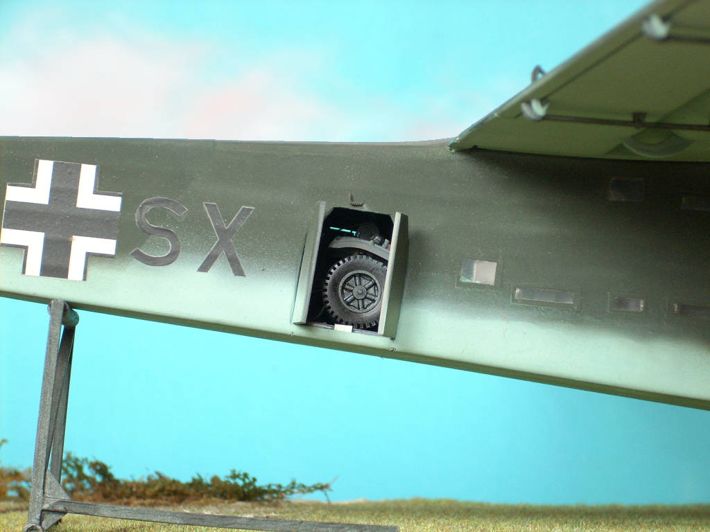 The Second World War's progress accelerated the searching for a widebodied operational glider, and this on each side of the front-line. The result of The Reich's concerted efforts was the Messerschmitt Me 321; a widebodied glider capable to carry troops, light and heavy equipments and even some special kind of tanks. I put an 8.8 Anti Aircraft Gun into my 321, complete with it's motor trac (kit by Hasegawa). This antique Italeri-kit, lately re-issued, shows raised panel-lines what's truly not up-to-date, but there is hardly anything other to be seriously criticized. In order to house the big gun, it was necessary to extend the rear cargo- compartment's floor. The gun also was tihgtly frapped, eyes and ropes were scratchbuilt. To the motor-trac I added a selfmade folding-top of paper-tissue and some steel-cables of simple copper-wire and one suitcase. The inner structure of tubular frames is well molded; the cockpit lacks some details, therefore I added seat-belts und some smaller equipment. The landing-vats, it's shock absorbers and the droppable undercarriage are detailed well enough for this scale. These opened enormous front-hatches' hinges and the provisional wooden loading-ramp are selfmade, as are the smaller loading-hatches in the rear fuselage and the strange leverage-instrument designated to raise up the tail. The Me 321 was a real tail-sitter when unloaded. Finally I added some ignition-wiring to the RATO (rocket-assisted-take-off) devices underneath the wings. >> Part II General view |
