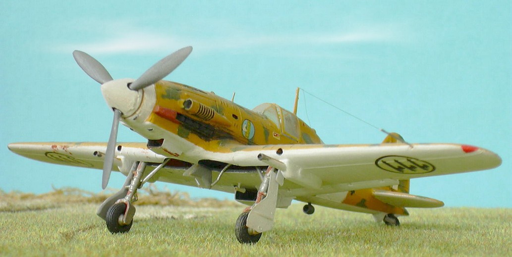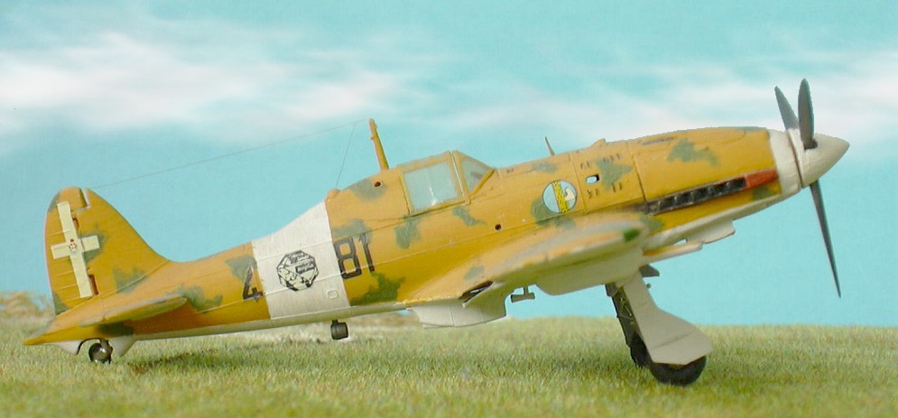 Basically the MC 202 was not much more than a MC 200, equipped with the Alfa Romeo AR.1000 (a license built German DB 601) instead of the MC 200's radial emgine. This change proved to become an advantage. The top-speed raised to approximately 600 km/h. The Supermodel kit is a really antique one and my skilfulness in modelling was not so experienced as nowadays; nevertheless such exotic gadgets like rubber tyres and a rather well moulded undercarriage were something special. Additionally, at that time this was the only kit available of a MC 202 in 1:72. Building this kit was rather simple, I just added a gun-sight and seat-belts and a selfmade vacu-canopy. I made the camouflage as told in the kit's guidance with a simple brush, the markings partially came from the kit and from my spare-box. |